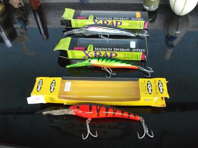 Our lures are mainly Rapalla X-Raps diving to 15, 20 and 30feet. Our preferred lure is the black and silver mackerel which you can see in the top of the photo below. We also stock a range of the X-raps that are also available on board. As well as these we stock Storm lures, especially the Deep Thunder series and find them an excellent series of lures. We mainly use nylon line and 3 foot steel traces because we fish over rocks. The rods are located into plastic sleeves attached to the boat, so you do not have to hold them all the time. We use Shimano gear whenever possible and we set everything up for you so that you can relax and enjoy the trip. Dolphins often are seen whilst we troll. Our boys – Prem and Uncle – are available to help you, and water and beer are normally available on the trip. Prem runs the bar at shack rates. Food is not provided on the boat.